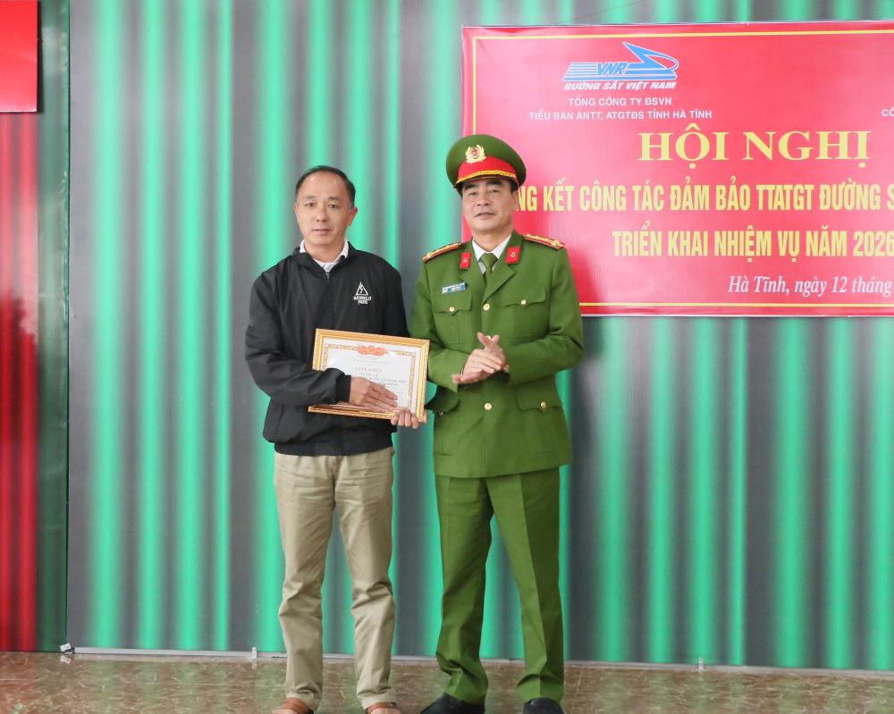 Tại hội nghị, ngành Đường sắt và Công an tỉnh Hà Tĩnh đã trao giấy khen cho các tập thể và cá nhân có thành tích xuất sắc trong công tác phối hợp đảm bảo an ninh trật tự và an toàn giao thông đường sắt năm 2025.